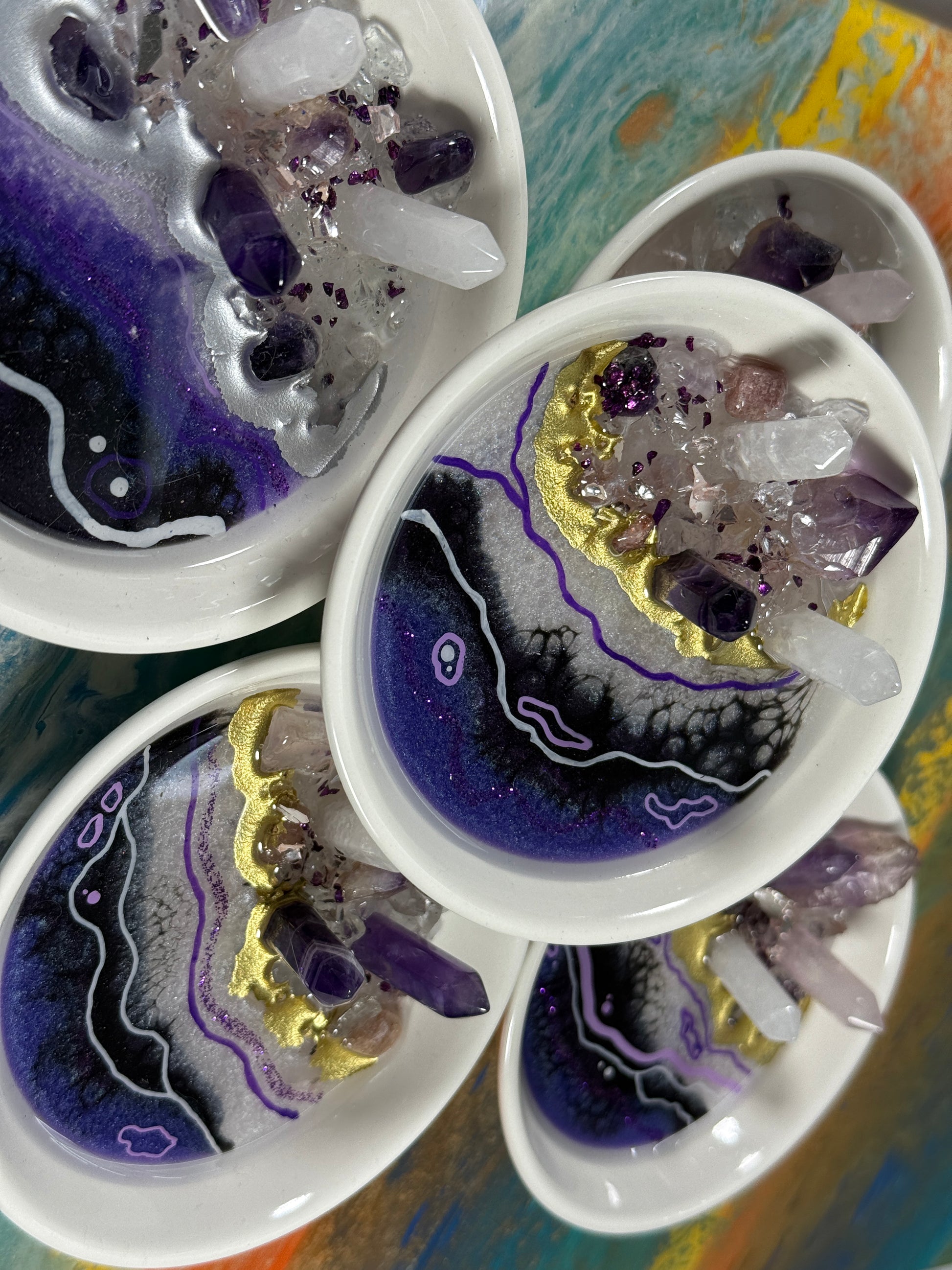 These exquisite trays are perfect for holding your rings, earrings, necklaces, and more. Each tray is meticulously crafted to resemble the natural beauty of a geode, with shimmering crystals and vibrant colors that catch the light beautifully. Whether you're looking to organize your jewelry in style or add a touch of elegance to your vanity, these trays serve as both functional and decorative pieces. Upon placing your order, you will receive one of the stunning trays shown in the photo above, each uniquely capturing the intricate details and organic shapes found in nature.