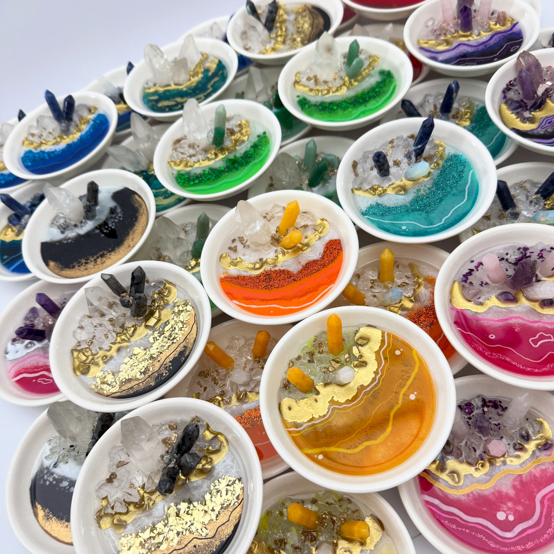 These exquisite trays are perfect for holding your rings, earrings, necklaces, and more. Each tray is meticulously crafted to resemble the natural beauty of a geode, with shimmering crystals and vibrant colors that catch the light beautifully. Whether you're looking to organize your jewelry in style or add a touch of elegance to your vanity, these trays serve as both functional and decorative pieces. Upon placing your order, you will receive one of the stunning trays shown in the photo above, each uniquely capturing the intricate details and organic shapes found in nature.